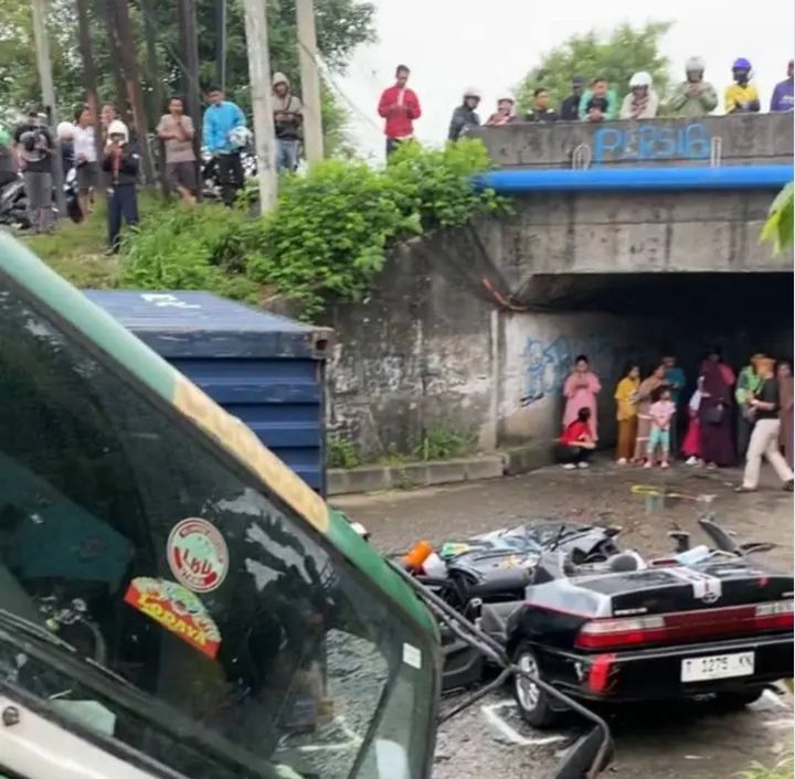 Nahas, pada saat bersamaan sebuah mobil sedan berada di lokasi dan langsung tertimpa badan kontainer. Benturan keras menyebabkan sedan mengalami kerusakan parah dan para penumpang di dalamnya terjebak sebelum akhirnya berhasil dievakuasi oleh warga dan petugas.