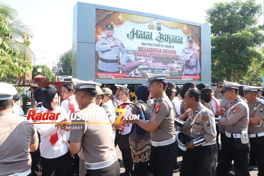 Radar Nusantara7.Com//kota Madiun- Polres Madiun Kota menggelar kegiatan halal bihalal yang diikuti oleh seluruh anggota, Senin (30/3/2026). Kegiatan tersebut berlangsung di Lapangan Apel Sakip Sanali Polres Madiun Kota dalam suasana penuh kebersamaan dan kekeluargaan pasca perayaan Hari Raya Idul Fitri 1447 H.