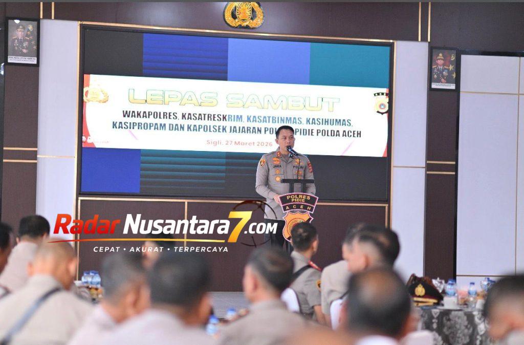 Radar Nusantara7.Com//Pidie – Polres Pidie Polda Aceh melaksanakan upacara Serah Terima Jabatan (Sertijab) sejumlah pejabat utama dan Kapolsek jajaran, Jumat (27/3/2026) pagi.